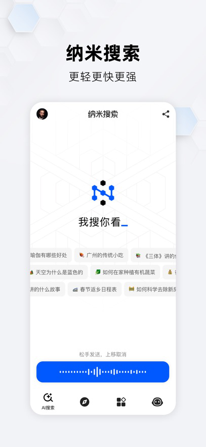 纳米搜索,开创全新问答方式,让搜索变得简单直观。