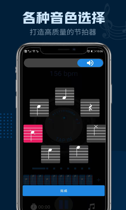 1.瑾软节拍器包含丰富的拍号、速度和细分节奏型,并内置了十种高品质音色供你选择.除此之外,计时器功能可以设置倒计时或小节计数,让练习更加方便.闪光灯功能可以让你在静音状态下也能保持准确的节奏,帮助你在日常生活中随时随地的练习节奏节拍.