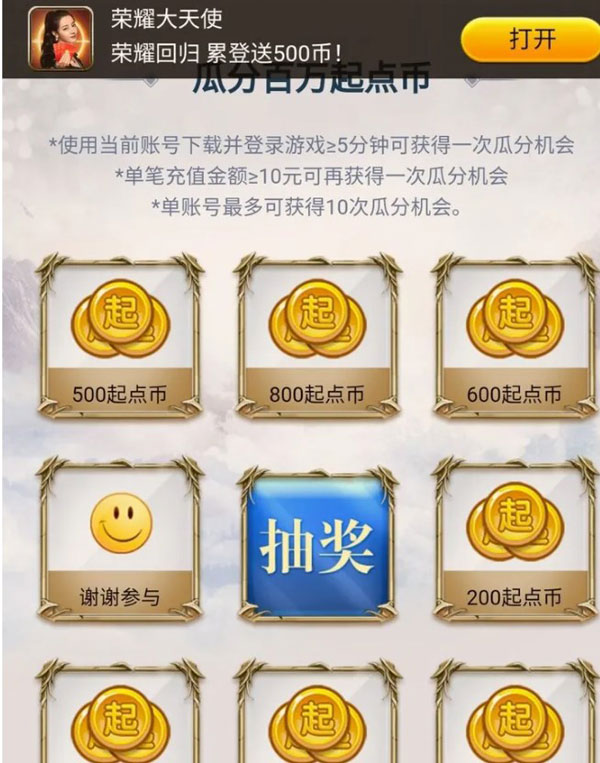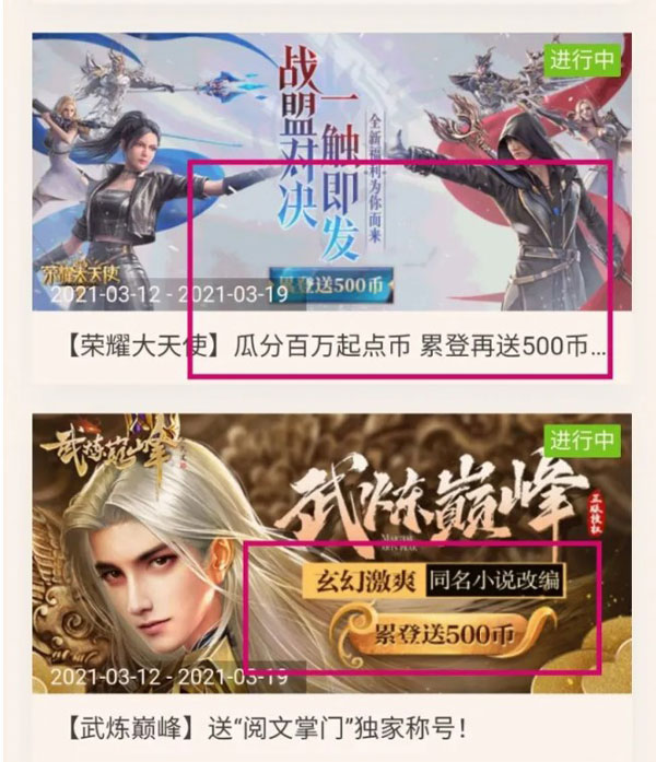 (2)点活动,进入后再点一次游戏活动,找到“累计登录送500起点币”,这种类型的游戏,下载并玩,零氪。