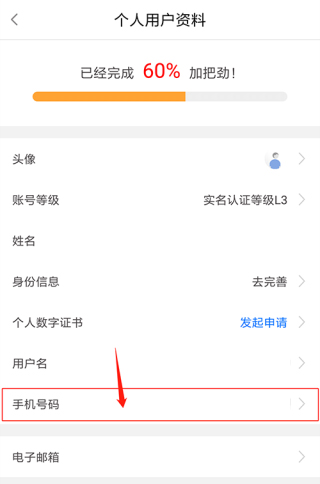 4、在“个人用户资料”中,点击“手机号码”一栏;