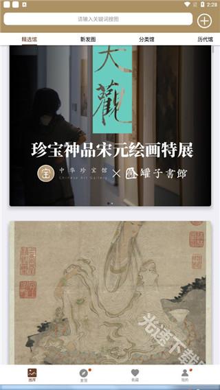 1、软件收集了从“晋代”到“当代”的大量书画资料,画面清晰无瑕,色彩准确,可见真丝。