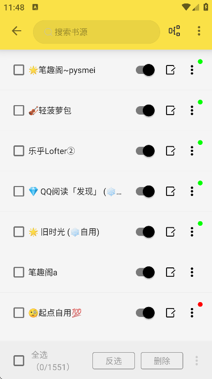 用户在个人中心点击书源管理即可进行书源的设置,有上百个书源可以进行设置,选择开启或关闭即可。