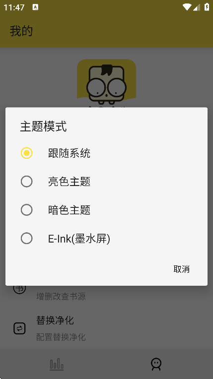用户在个人中心点击主题模式,可以设置跟随系统、亮色、暗色、墨水瓶四个主题。