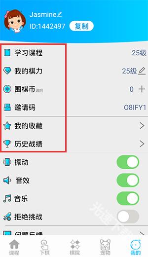 5、点开我的,可以查看学习课程、我的棋力、围棋币、历史战绩等。