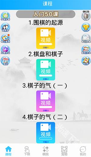2、在课程这里有学前必看、进群学、每日签到、兑换礼品、围棋的起源等,还可以看视频学习围棋知识;