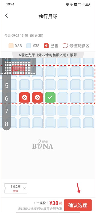 3、红色表示已经出售,淡蓝色表示还未出售,选好观影的位置,点击下方的“确认选座”按钮。
