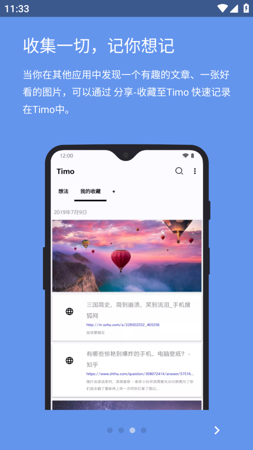 当你在其他应用中看到想收藏的内容,可以通过""分享-收藏到Timo"",轻松快速保存在Timo中,想保存的东西一样不落。