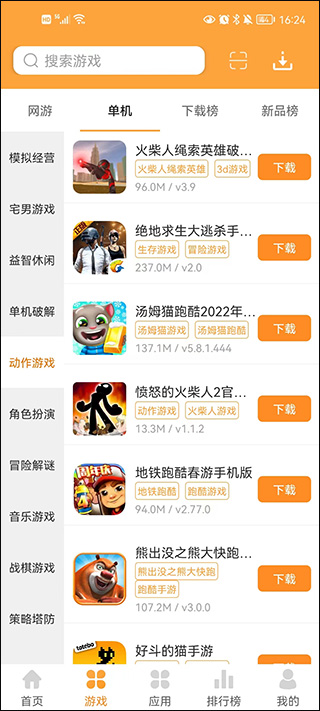 在游戏的版块中有很多分类,包括了单机、网游、下载榜单、新品榜等等。