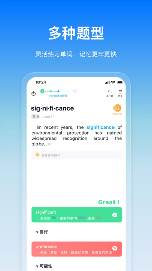 鲸鱼爱语境融合多元功能,让学习趣味又高效。它按不同学习阶段编排课时,无论基础如何,都能循序渐进学词汇、语法,练听说读写。引导式学习细致贴心,分步讲解知识点,动态反馈助你攻克语言难点。词文串记、填词还原等多种真题题型,从多维度强化记忆,全面提升语言运用能力。还有趣味互动环节,让你在情境中沉浸式学习,真正做到学以致用。