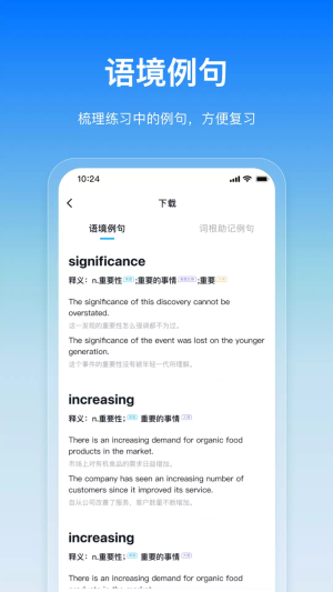 鲸鱼爱语境:侧重应试提分,以课时练习、真题题型(如词文串记、填词还原)系统提升语言运用能力,界面简洁专注学习,适合备考学生。