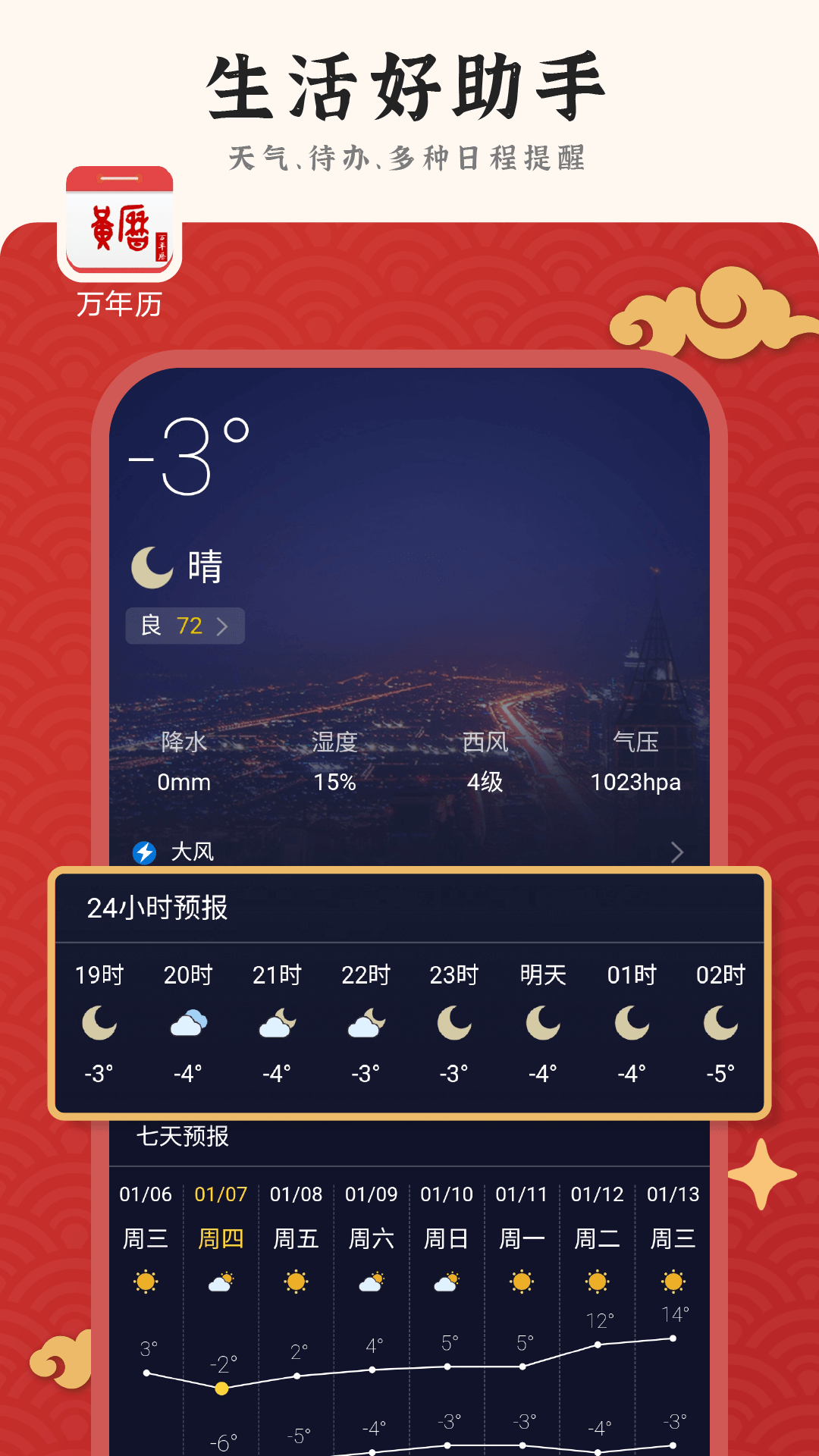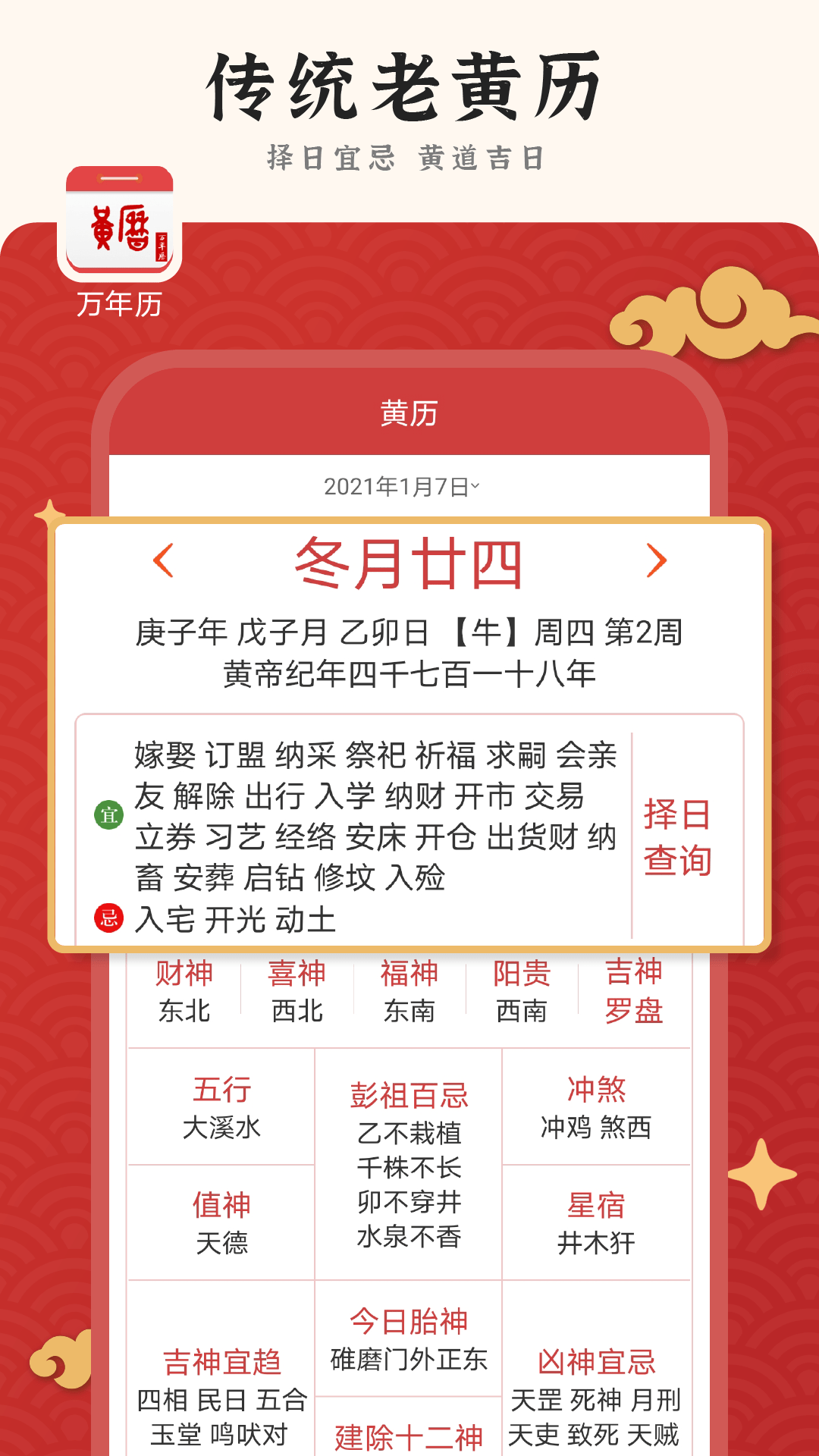我是个传统文化爱好者,万年历里的老黄历板块简直太对我胃口了!每天出门前,我都习惯瞅瞅当日宜忌,像搬家、出行这些事儿,参考着黄历安排,心里特别踏实。而且软件对传统节日、节气的科普超详细,让我深入了解到不少民俗知识,它就像一位传统文化导师,伴我日常,超实用!