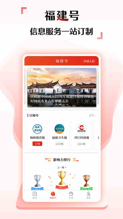 2.抢先获取全新资讯,精准推送定制新闻,轻松掌握福建省内媒体信息,个性化订阅政务新闻、生活资讯、地方新闻。