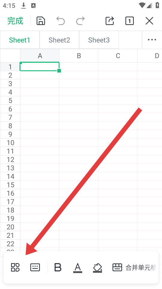1、在WPS表格编辑界面,点击底部左侧四方格功能菜单图标,展开包含多项操作的功能列表。