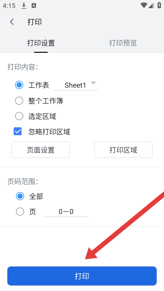 3、在打印设置界面选定工作表、页码范围等参数后,点击底部蓝色的打印按钮,即可发起打印任务。
