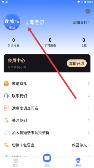 1、打开准橙普通话测试APP,在首页点击底部我的图标,进入包含会员中心、功能选项的个人页面。
