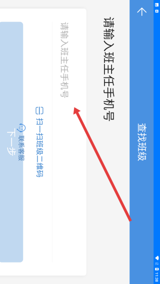 3、进入查找班级页面,在输入框填写班主任手机号,也可扫码或联系客服,逐步完成注册账号流程。