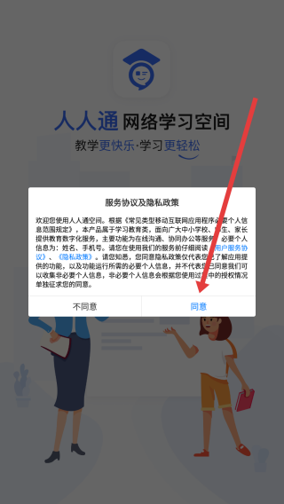 1、进入人人通网络学习空间,弹出服务协议及隐私政策弹窗,点击同意,方可继续进行登录、注册等后续操作。
