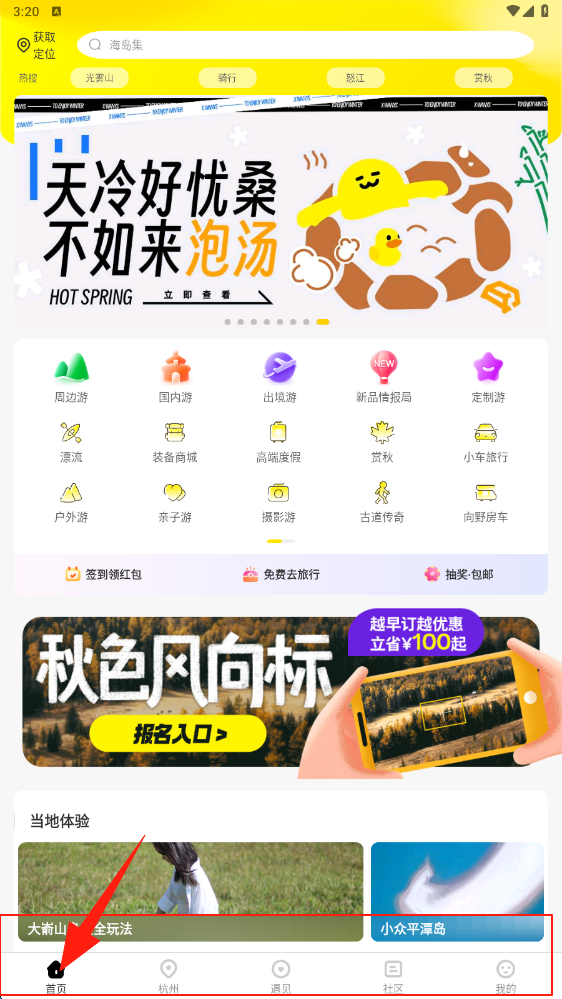 1、在首页,浏览周边游、国内游等分类,点击秋色风向标等活动,了解旅行项目,点击选择类型。