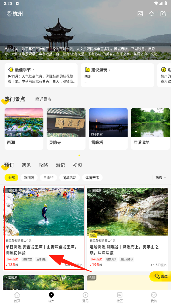 2、切换到杭州页面,查看当地热门景点,选择单日溯溪等旅行产品,了解详情并预订。