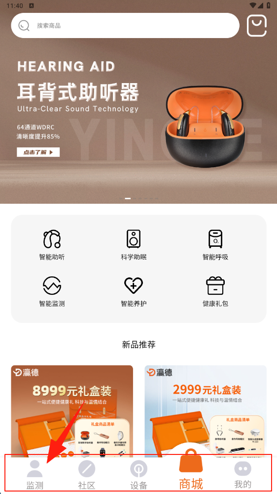 1、在商城页面,可浏览智能助听等健康产品,查看新品推荐,点击分类进入对应功能模块。