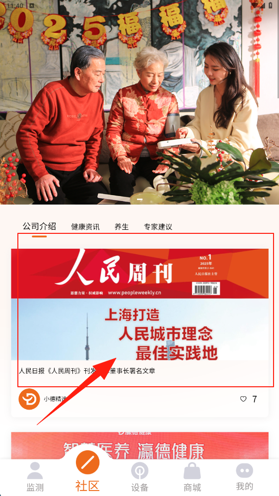 2、切换到社区页面,浏览健康资讯、养生内容,点击感兴趣的文章如人民周刊相关内容阅读。