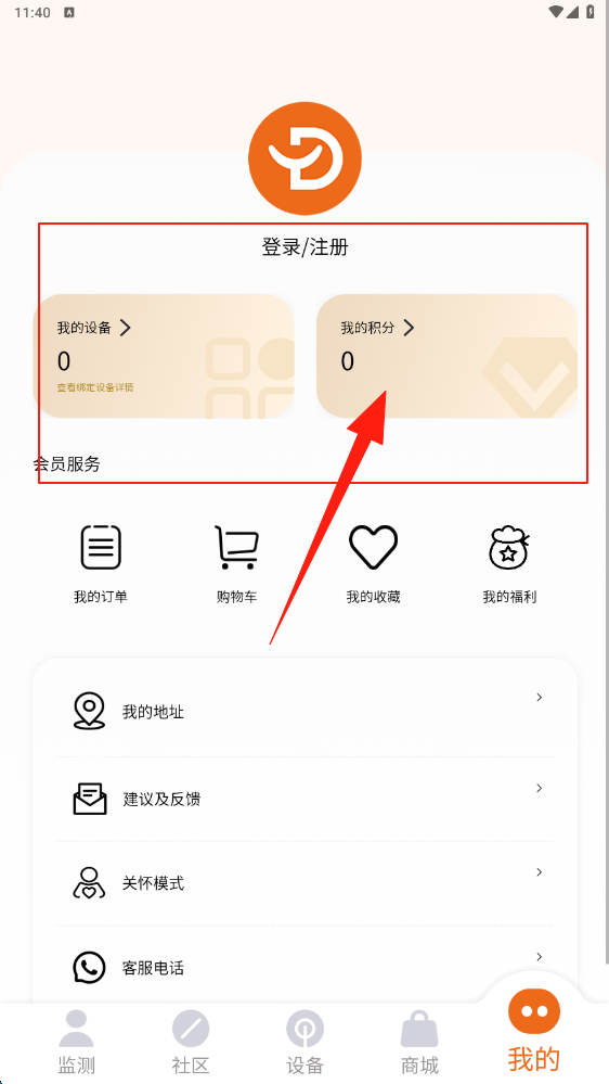 3、进入我的页面,查看我的积分、设备等信息,管理订单、地址,反馈建议或联系客服。