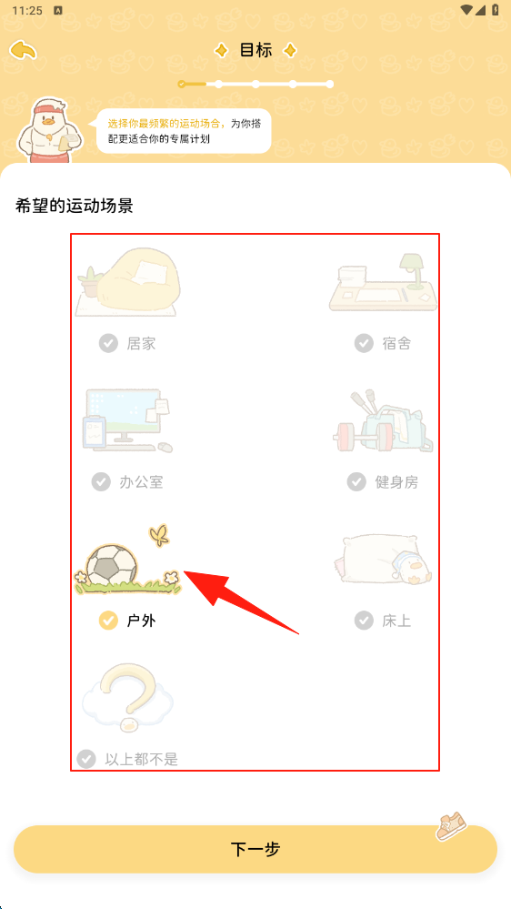 2、切换到运动场景页,勾选户外场景,明确日常运动环境,点击下一步进入特殊场合选择。