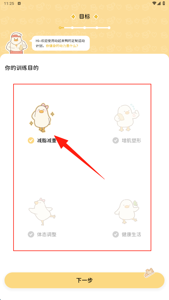1、在训练目标页,选择减脂减重选项,确定健身核心目标,点击下一步进入场景选择。