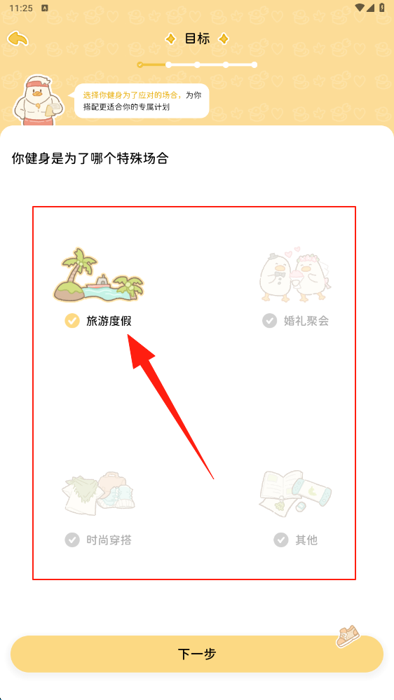 3、在特殊场合页,选定旅游度假,关联健身需求场景,点击下一步生成专属运动计划。
