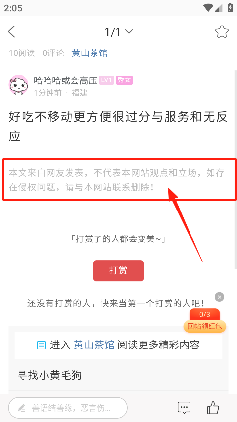 3、此为市民网中某条帖子的详情页面,展示了网友发布的内容,表明网友发表的内容不代表网站观点和立场,若存在侵权问题,可联系网站删除,同时还设有打赏等互动功能。
