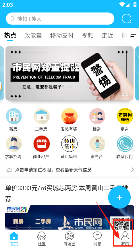 1、这是市民网的首页,设有众多功能入口,方便用户查找不同类型的信息,页面底部的我的按钮是关键,点击它可进入个人中心页面,在那里能进行个人相关的操作与设置。