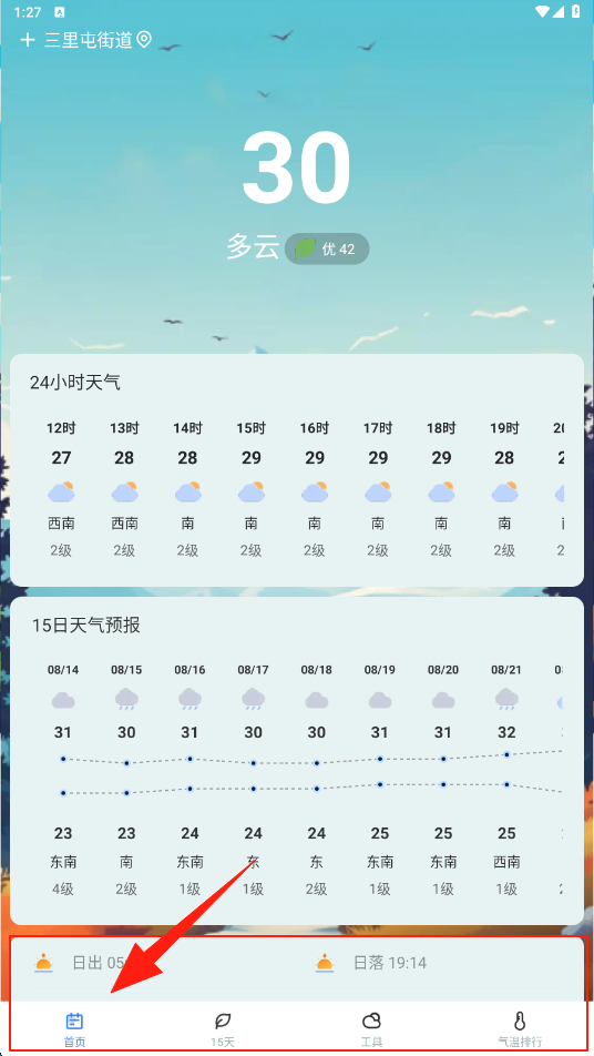 1、进入APP,在首页查看当日天气如30℃多云 、24小时及15日天气预报,点击选择类型。