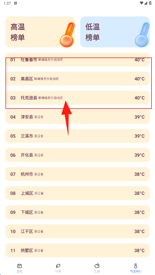 3、进入气温排行页,浏览高温榜单如吐鲁番市等40℃ ,了解各地气温情况,点击查看温度。