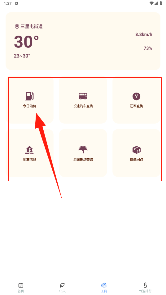 2、切换到工具页,使用今日油价长途汽车查询等实用功能,点击查看今天的油价。
