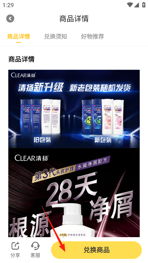 3、该界面是商品详情页,以清扬洗发水为例,展示了商品的新老包装、功效等详细信息,若对商品满意,点击兑换商品按钮,即可用相应积分或方式兑换该商品。