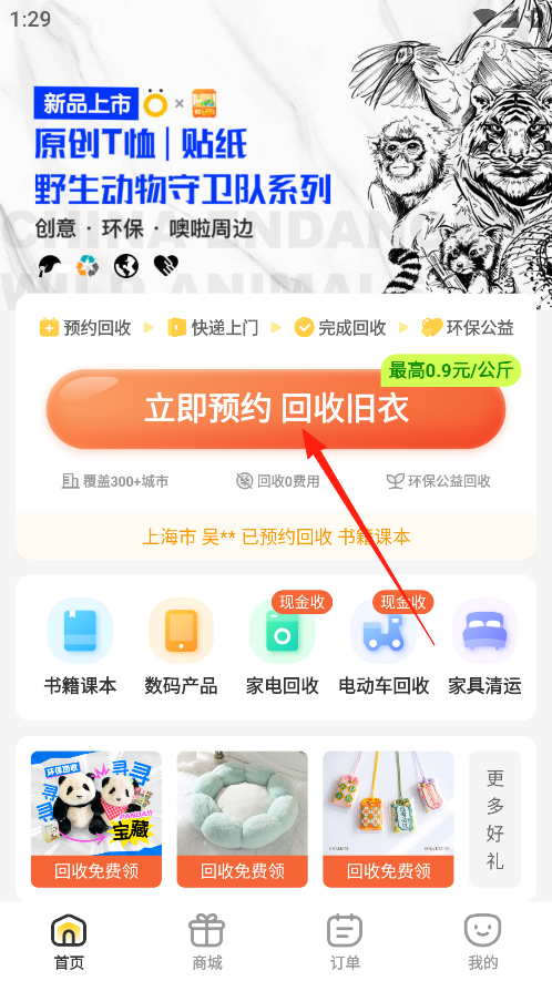 1、该界面是软件的首页,用户点击可预约旧衣回收,此外页面展示了新品上市的原创T恤等商品,以及回收免费领好礼活动,为用户提供回收和购物等多元服务。