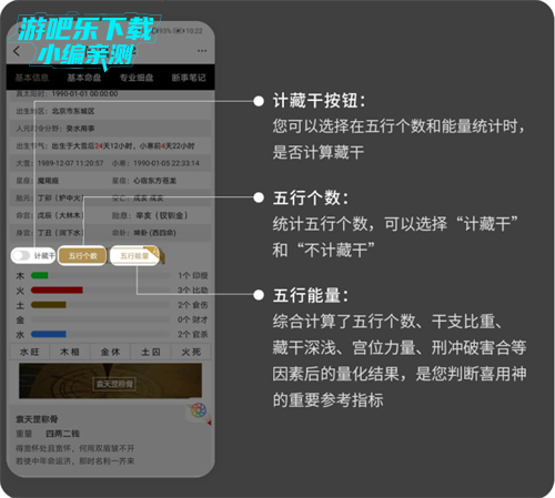除此之外,智能五行分析模块对命盘的五行能量做了定量的分析,这就是我个的“五行个数”和“五行能量”功能