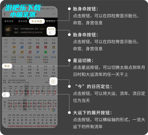 专业细盘在基本命盘的基础上,加上了大运与流年的罗列,便于大家进行命盘的时空研究。除此之外,还有几个细节功能需要留意: