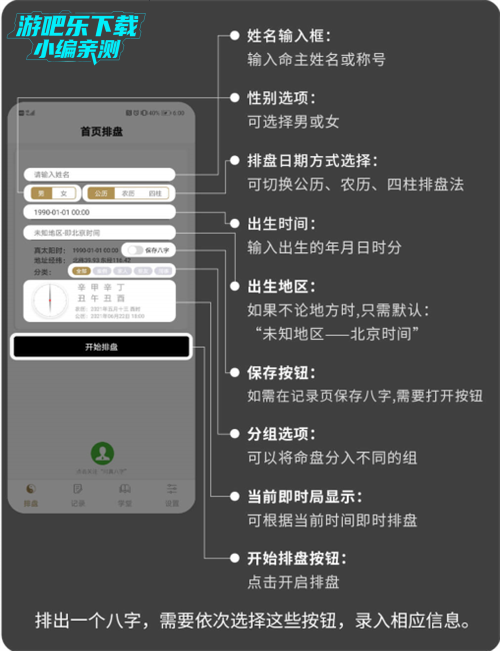 3、进入软件后默认为排盘页面,在此页面可以输入自己的个人信息开始排盘。