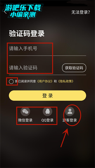 2、初次使用软件可以使用手机号验证码进行注册/登录,同时还支持微信、QQ一键授权登录,若你想先体验一番可以选择游客登录哦!