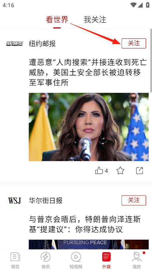 3、在看世界板块,你能看到不同媒体发布的新闻,要是你对某个媒体的内容感兴趣,就点击它旁边的关注按钮,这样以后这个媒体发布的新闻,你就能更方便地看到了。