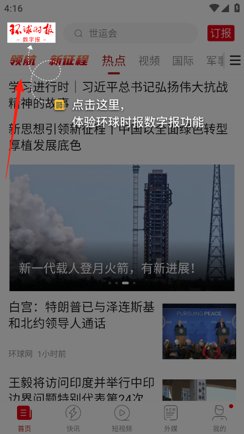 1、在首页看到说,点击环球时报可以体验环球时报数字报功能,还有别的视频,国际军事赛道的新闻可以看。