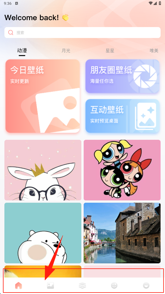 1、在首页可浏览动漫分类壁纸,选择今日壁纸朋友圈壁纸等模块,挑选喜欢的壁纸资源。