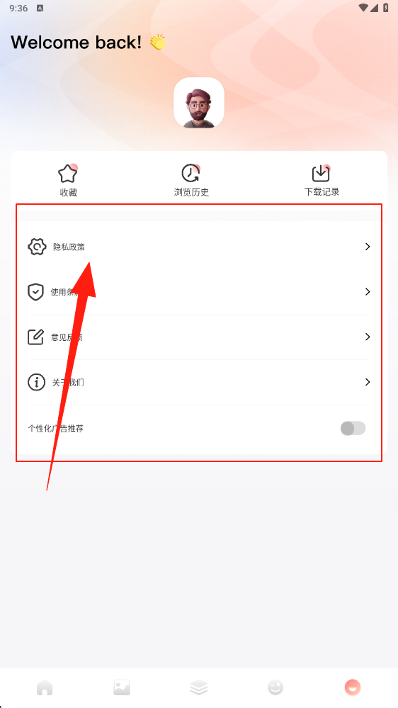 3、在个人页面,可点击隐私政策选项,了解应用隐私相关内容,也能查看收藏浏览历史等。
