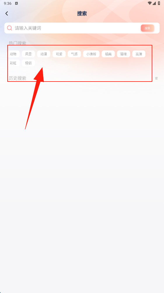 2、进入搜索页,通过热门搜索标签如动漫可爱等,或输入关键词,快速查找目标壁纸内容。