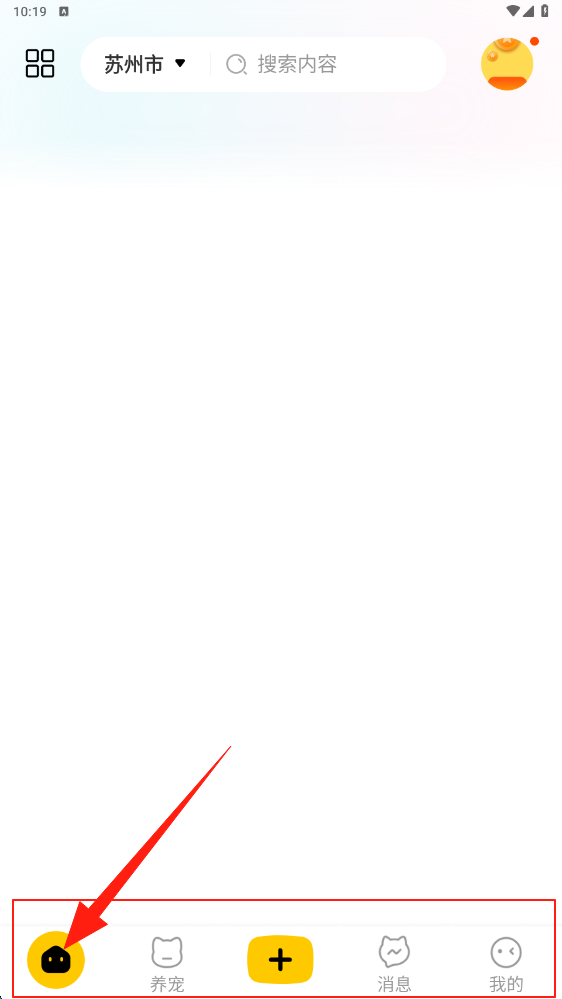 1、在首页点击左下角图标,进入对应功能页面,可切换城市或使用搜索,探索养宠相关内容。