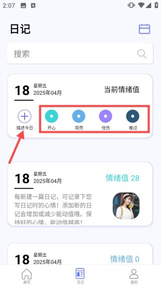 2、可以看到有开心、坦然、忧伤、难过情绪任意选择,还可以点击页面中的【描述今日】按钮