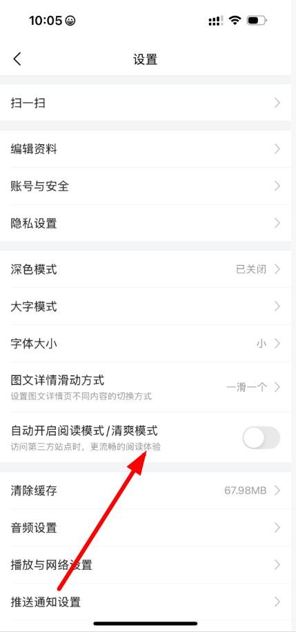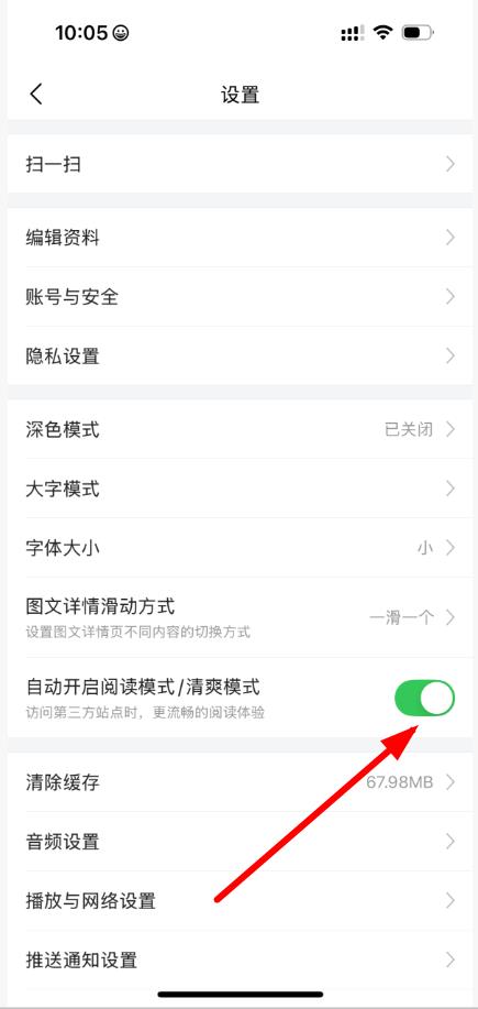 3、点击自动开启阅读模式/清爽模式选项右侧的开关按钮,将其开启即可。