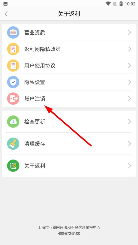 3、在关于返利页面里,点击账户注销选项,按照页面提示的流程进行操作,完成后即可注销返利网账号。