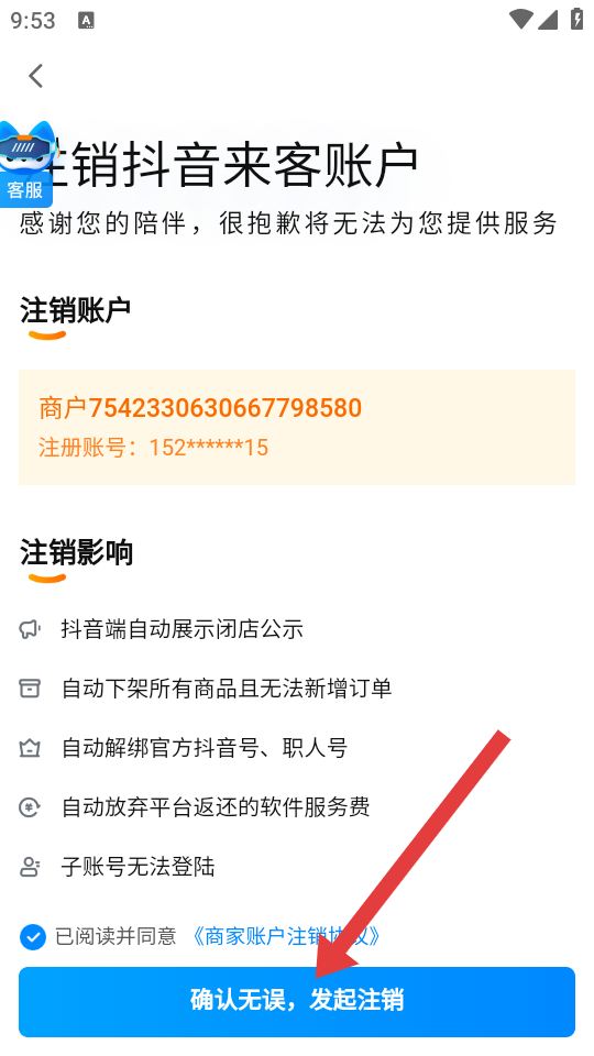 3、阅读注销影响,勾选协议后,点击确认无误,发起注销的按钮,完成抖音来客账号注销申请。
